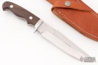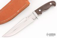 This fixed blade by Tim Steingass features a satin finished blade with a sharpened top edge, notched thumbrest, .224" blade stock and 1.454" blade depth, full tapered tang construction. The handle features a stainless steel guard, green canvas micarta scales with red liners. Includes a brown leather sheath. Has a few very light scratches, otherwise excellent condition.