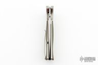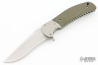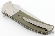 The RJ Martin Q-36 won the award for Best Tactical Folder at the 2007 Blade Show in Atlanta. This Q-36 flipper from RJ Martin features a stonewash finish drop point recurve blade with notched thumb ramp and flipper The handle has orange peel finished titanium bolsters and liners, green G-10 scales, black G-10 backspacer and a titanium tip up clip. Powerful and smooth flipper opening allows you to easily deploy the blade with no wrist action needed. Nice blade seating, detent and lockup. Excellent work. Excellent condition. Comes with a zippered case.