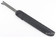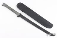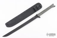 This Rodent Waki by Swamp Rat Knives features a black coated blade, .188" blade stock and 1.386" blade depth, full tang construction. The handle has black/green G-10 scales with hollow pins and an extended tang. Comes with a custom kydex sheath by Buy Brown. Excellent condition.