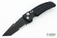 This EX-A01 by Hogue Knives is an Allen Elishewitz design, it features a black tanto partially serrated 154CM blade with notched thumbrest. The handle is black aluminum, tip up or down reversible black stainless steel clip. Has safety. Comes with Hogue box and papers. New condition.