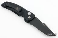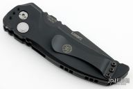 This EX-A01 by Hogue Knives is an Allen Elishewitz design, it features a black tanto partially serrated 154CM blade with notched thumbrest. The handle is black aluminum, tip up or down reversible black stainless steel clip. Has safety. Comes with Hogue box and papers. New condition.
