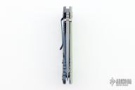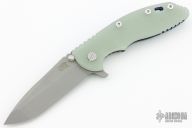 This XM-18 Flipper by Rick Hinderer Knives features a 3.5" stonewashed blade, notched thumbrest and flipper, dual thumbstuds. The handle has a translucent G-10 scale, and an anodized titanium handle and satin finished hardware, and titanium clip. Clip can be mounted for tip up or down carry. Nice lockup, seating, and detent. Excellent condition.