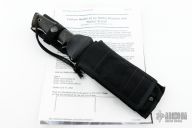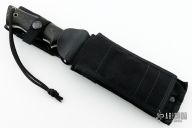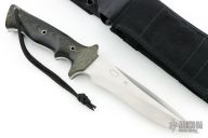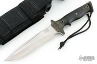 This Custom Model 2 is a Walter Brend design made by Bobby Branton and Walter, Walter ground the blades and Bobby did the handles. It has a hand rub satin finished recurve blade with sharpened top edge, .254" blade stock and 1.445" blade depth, full tang construction. The handle has black canvas micarta scales with hollow pins and lanyard hole. Comes with a black nylon sheath with a front pouch. Excellent condition. #8