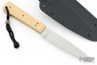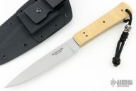 This knife by David Lancaster Clark features a hand rub satin finished blade with .160" blade stock and 1.045" blade depth, full tang construction. The handle has yellow paper micarta scales with black liners, fileworked tang spine. Comes with a kydex sheath. New from maker.
