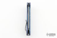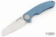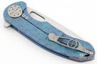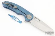 This Large F3 from Curtiss Knives features a polished tumble finished wharncliffe style blade with swedge, notched thumb rest and flipper. The handle is comprised of an anodized jigged titanium frame over notched titanium backspacer. Bead blasted and machined titanium tip up clip with lanyard hole in pommel. Includes padded and zippered case and a maker's card dated 1/13/23. The knife is missing detent ball, and can be shaken open. Excellent condition otherwise.