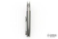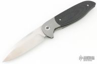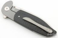 This knife features a satin finished drop point blade and notched thumbrest. The handle has a bead blasted titanium frame with a matching tip up pocket clip and carbon fiber scales. Includes a padded zippered case. Excellent Condition.