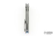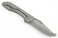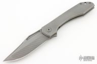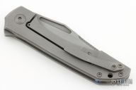 This Un-Bo flipper from Simeon Custom Knives features a smoke finished blade with milled bevels, flipper and milled thumbhole. The handle has a stonewashed titanium frame with a titanium tip up pocket clip. Rides on bearings, nice detent, lockup and blade seating. Has some light scuffs, has been resharpened, otherwise good condition.