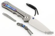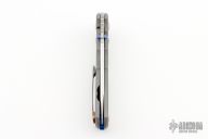 This Large Inkosi from Chris Reeve features a tumble finish blade with dual thumb-studs and a bead blast titanium frame. Has lightning anodized clip, tip up carry. Has blue backstrap. Comes with original box, and papers dated August 15, 2019. Also includes original bead blast clip, assembly post, and two lanyards. Nice detent, and blade seating. Has some light scuffs, otherwise excellent condition.