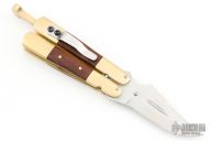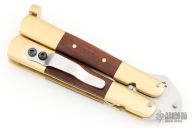 This balisong by Seth Ofgang features a satin finished blade. Has brass bolsters, rosewood scales, brass liners and a brass T-latch, and a tip up stainless steel clip. New from maker.
