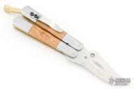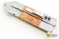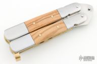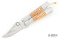 This balisong by Seth Ofgang features a satin finished blade. Has stainless steel bolsters, olivewood scales, brass liners and a brass T-latch, and a tip up stainless steel clip. New from maker.