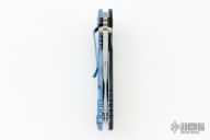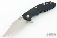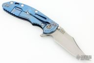 This XM-18 Flipper by Rick Hinderer Knives features a 3.5" stonewash finish blade, notched thumbrest and flipper, dual thumbstuds. The handle has a black G-10 scale, and stonewash blue finished titanium handle and satin finished hardware, filler tab, and titanium clip. Clip can be mounted for tip up or down carry. Nice lockup, seating, and detent. Comes with original box and extra hardware. New condition.