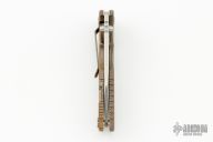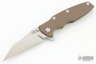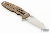 This Eklipse Flipper by Rick Hinderer Knives features a 3.5" stonewash finished blade, notched thumbrest and flipper, dual thumbstuds. The handle has a FDE G-10 scale, and stonewashed bronze titanium handle/clip. Clip can be mounted for tip up or down carry. Nice lockup, seating, and detent. Comes with original box and extra hardware. New condition.
