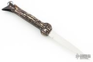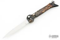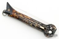 This vintage auto features a mirror polished blade with false top edge. The handle is faux stag. Has safety and lanyard bail. Has some scratches, otherwise good condition.