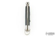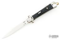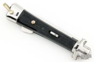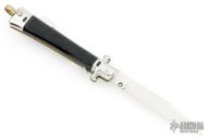 This Automatic by Bargeon features a mirror finished drop point blade with swedge. The handle has stainless steel bolsters and pommel with checkered plastic scales over coin edged brass liners and stainless steel lockbar. Push button release, sliding safety and brass lanyard bail. Has a few light scratches, otherwise excellent condition.