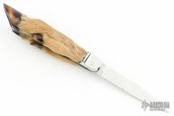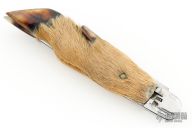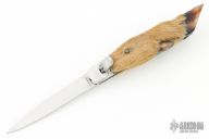 This leverlock auto by Makinox features a mirror polished blade. The handle has steel bolsters and liners, deef hoof/leg scales. Has some light scrathes, otherwise excellent condition. Very interesting piece.