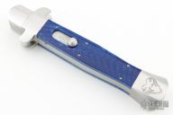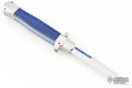 This Italian D/A OTF by Burn Knives features a mirror polish finished double-edged blade with satin flats blue abalone inlays. The handle has a stainless steel frame with Juma Blue Snakeskin scales, stainless button. Snakehead engraved on tail. Comes with zipper case and COA dated 7/27/22. Nice action and lockup. Excellent condition.