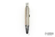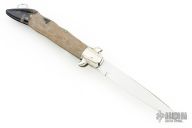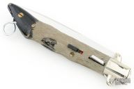 This vintage auto features a mirror polished blade with false top edge. The handle has nickel silver bolsters and faux stag. Has safety and lanyard bail. Has some scratches, otherwise good condition.
