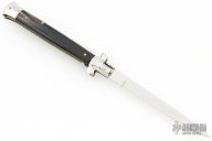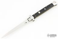 This 11" Swivel Bolster auto from the 1970s was made by Virginia INOX of Maniago Italy, it features a mirror polished and flat ground blade. The handle has stainless steel bolsters, front and rear, buffalo horn scales, brass liners, stainless spring. Has some light scratches, otherwise excellent condition.