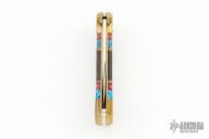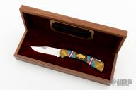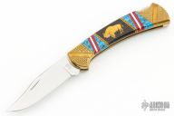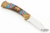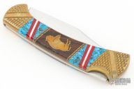 This Buck Model 112 knife Customized by David Yellowhorse is a lock back with brass bolsters, ironwood, turquoise, jasper and brass spacers. Satin finished blade. Strong lock up. Includes a padded wood display case.  Excellent condition.