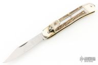 This Lever Lock Automatic by Hubertus Knives features a polished clip point blade. The handle is comprised of nickel silver double bolster and lever with stag scales over brass liners and steel backspacer. Has some light scratches and patina, otherwise excellent condition.