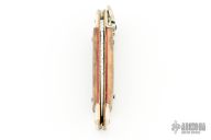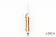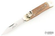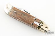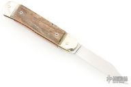 This Lever Lock Automatic by Hubertus Knives features a polished clip point blade with nail nick and file worked spine. The handle is comprised of nickel silver double bolster and lever with mammoth scales over red and brass liners and file worked steel backspacer. Has some light scratches and patina, otherwise excellent condition.