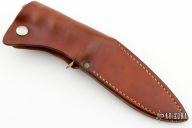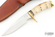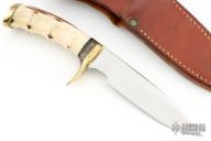 This Hunter by Clyde Fischer features a satin finished blade, .188" blade stock and 1.203" blade depth, hidden tang construction. The handle has a brass guard and butt and a stag grip with finger grooves, buffalo horn spacer. Comes with a brown leather sheath with belt loop. Has some light scratches otherwise excellent condition.