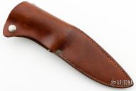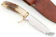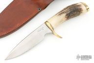This Hunter by Clyde Fischer features a satin finished blade, .179" blade stock and 1.211" blade depth, hidden tang construction. The handle has a brass guard and butt and a stag grip. Comes with a brown leather sheath with belt loop. Has some light scratches otherwise excellent condition.