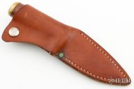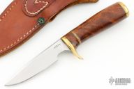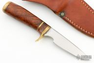 This Hunter by Clyde Fischer features a satin finished blade, .164" blade stock and .862" blade depth, hidden tang construction. The handle has a brass guard and butt and a Mesquite wood grip with brass spacer. Comes with a brown leather sheath with belt loop. Has some light scratches otherwise good condition.