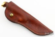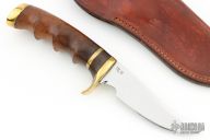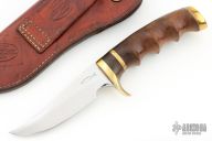 This Skinner by Clyde Fischer features a satin finished blade, .191" blade stock and 1.141" blade depth, hidden tang construction. The handle has a brass guard and butt and a Mesquite wood grip with brass spacer. Comes with a brown leather sheath with belt loop. Has some light scratches, otherwise excellent condition. Has the initials "GLW" on the blade.