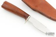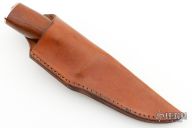 This Hunter by Clyde Fischer features a mirror finished blade, .129" blade stock and 1.041" blade depth, hidden tang construction. The handle has a nickel silver guard and butt and a Mesquite wood grip. Comes with a brown leather sheath with belt loop. Has some light scratches and patina, otherwise good condition.