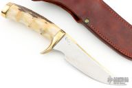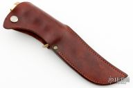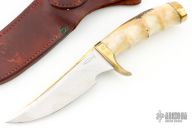 This Skinner by Clyde Fischer features a satin finished blade with brass back (parry guard), .225" blade stock and 1.429" blade depth, hidden tang construction. The handle has a brass guard and butt with a stag grip. Comes with a brown leather sheath with belt loop. Has some light scratches and patina, otherwise good condition. Has the initials "C.S.H." on the blade.