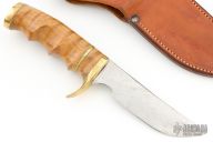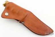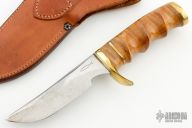 This Skinner by Clyde Fischer features a mirror finished blade, .185" blade stock and 1.141" blade depth, hidden tang construction. The handle has a brass guard and butt and a Mesquite wood grip with brass spacer. Comes with a brown leather sheath with belt loop. Has some light scratches and patina, otherwise good condition.