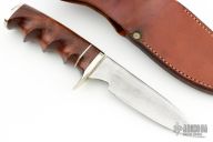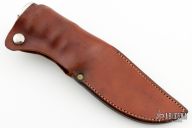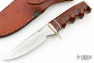 This Hunter by Clyde Fischer features a satin finished blade, .183" blade stock and 1.214" blade depth, hidden tang construction. The handle has a nickel silver guard and butt and a Mesquite wood grip and nickel silver spacer. Comes with a brown leather sheath with belt loop. Excellent condition.