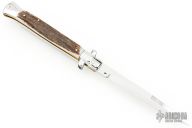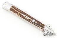 This 11" Swivel Bolster by Frank Beltrame features a mirror finished bayonet ground blade with false top edge. The handle has mirror polished stainless steel bolsters, front and rear, stag scales, mirror polished brass liners and stainless steel spring. Excellent condition. Comes with a brown leather slip sheath. This one was tuned and polished by Greg's Effects and comes with COA dated Dec 3, 2023. The swivel bolster is a little tight on this one and hard to press, but it will probably loosen up over time.