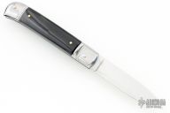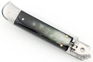 This Lever Lock Auto has a mirror polished stainless steel spear point blade. Handle has buffalo horn scales, steel front and rear bolsters, stainless steel liners and a nickel silver lock release button. Excellent Condition. Comes with a leather slip sheath. This one has been tuned and polished by Greg's Effects and comes with a COA dated Dec 3, 2023.