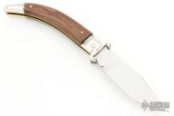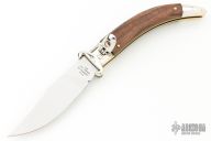 This Diana lockback auto by AGA Campolin features a mirror polished blade, mirror polished nickle silver bolsters and rosewood scales, brass liners. Nice function, strong firing and lock up. Excellent condition. Dated 2021. Comes with leather sheath. Has 16 and 12 gauge shotgun shell puller bolsters. This one has been tuned and polished by Greg's Effects and comes with a COA dated Dec 3, 2023