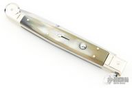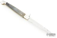 This Sicilian Ring Pull Stiletto from AGA Campolin features a tumbled bayonet ground blade. The handle has a nickel silver bolsters and ring-pull with honey horn scales over brass liners and stainless steel backspacer.  Includes a leather slip sheath, original box and COA.  Excellent Condition. Comes with a wooden display box. This one has been tuned and polished by Greg's Effects and Comes with a COA dated Dec 3, 2023.