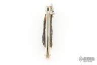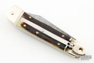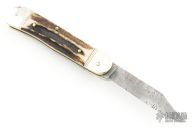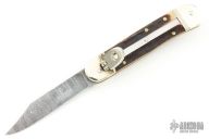 This Lever Lock Automatic by Hubertus Knives features a Damascus clip point blade. The handle is comprised of nickel silver double bolster and lever with stag scales over brass liners and steel backspacer. Has some light scratches and patina, otherwise excellent condition.