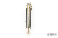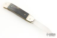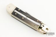 This Lever Lock Automatic by Hubertus Knives features a clip point blade with nail nick and file worked blade spine. The handle is comprised of nickel silver double bolster and lever with blonde horn scales over brass liners and steel backspacer. Has some light scratches and patina, otherwise excellent condition.