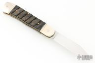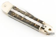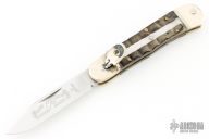 This Lever Lock Automatic by Hubertus Knives features a clip point blade with nail nick. The handle is comprised of nickel silver double bolster and lever with horn scales over brass liners and steel backspacer. Has some light scratches and patina, otherwise excellent condition.