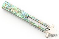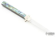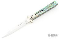 This Leverlock Auto by AGA Campolin has a polished stainless steel spear point blade with false top edge. Handle has abalone scales with black liners, nickel silver bolsters, stainless steel liners and backspacer. Has a few light scratches and patina otherwise excellent condition.