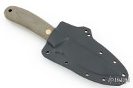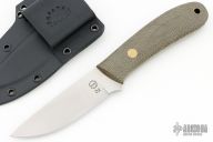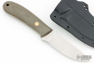 This K-16 Yukon Pro Skinner by Dozier Knives features a satin finished blade with .137" blade stock and 1.015" blade depth, full tang construction. The handle has green canvas micarta scales with brass pins and lanyard hole. Comes with kydex sheath with belt clip. Excellent condition.