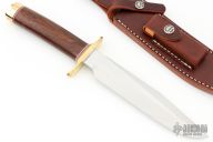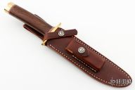 This Model 1-7 from Randall Made Knives features a satin finished clip point blade with sharpened top edge, .227" blade stock and 1.284" blade depth, hidden tang construction. The handle is comprised of a brass guard and butt, red/white/blue spacers, and a desert ironwood grip. Comes with brown leather sheath and a zippered case. Excellent condition.