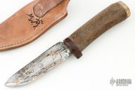 This knife by Miles Martin features a forged mosaic Damascus blade with bronze and copper forged into the blade, .178" blade stock and 1.268" blade depth, hidden tang construction. The handle has a Alaskan wood guard and butt, mammoth fossil rib bone grip. Comes with a painted brown leather sheath. New from maker. Comes with a COA.