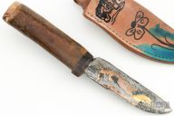 Along the way I realized I now had the tools to build my own knife blades. I work with steel, but work it hard and slow so do not do tempering. I still often buy good blades from a blade maker, and think I prefer the stories told in the handle materials best. I do my own acid etched scenes in the steel. I?m now maybe one of the experts on raw material, doing identifications for museums, restorations , appraisals, as well as doing my own art and supplying others. I have 9 buildings full of raw materials now. ?Truckloads? I have customers from all over the world come find me in Nenana Alaska on a pilgrimage to look over my materials, who are not disappointed. So I have lots to choose from when building a knife. I stopped counting my custom one of a kind art pieces at 10,00 items over 10 years ago. I?m a full time artist.