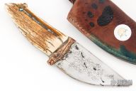 This knife by Miles Martin features a forged blade with acid etched flower motif with .066" blade stock and 1.965" blade depth, full tang construction. The handle has a cast copper guard in the shape of a fish made from 1920s water pipes under the Nenana School, mammoth ivory scales in the shape of a bears head with pieces of opal for the eyes. Comes with a brown leather sheath. New from maker. Comes with a COA.