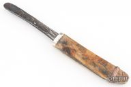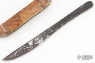 This knife by Miles Martin features a forged Damascus blade with acid etched flower motif, .141" blade stock and .673" blade depth, full tang construction. The handle is matching Damscus. Comes with an Alaskan birch sheath with silver and copper fittings. New from maker. Comes with a COA.