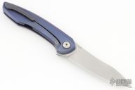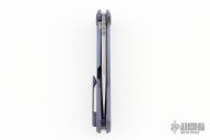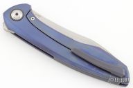 This Russkiy from Alexander Cheburkov features a matte finished blade with swedge, notched thumb rest and flipper. The handle has a tumbled and anodized titanium frame with an anodized titanium backspacer, pivot collars and tip up clip with hidden screws. Rides on bearings, nice detent, lockup and blade seating. Has stainless lock insert. Lanyard pin at the butt.  Includes original box and card. Has a couple light scuffs, otherwise excellent condition.