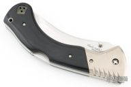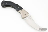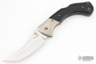 This Black Sable by Cold Steel features a polished, upswept san mai tanto style blade with swedge and dual thumb studs. The handle is comprised of titanium bolsters and black micarta scales over titanium liners and steel backspacer, has holes for a tip up reversible clip, but no clip. Has some scratches, otherwise good condition. Comes with a clip but no screws.