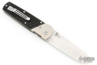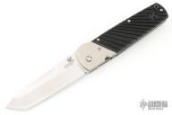 This Hatamoto linerlock by Cold Steel has a high satin finished San Mai III stainless steel tanto blade with dual thumb studs and notched thumb rest. Handle is black G10 over titanium liners and satin finished titanium bolsters. Stainless steel tip up reversible clip and lanyard hole. Has some scratches, otherwise good condition. Comes with original aluminum case.